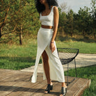 Women's midi skirt – Slim fit – High waist – Ribbed texture – Split – Soft knit