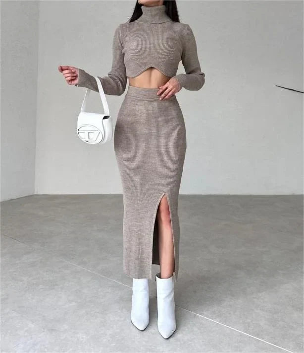 Women's midi skirt – Slim fit – High waist – Ribbed texture – Split – Soft knit