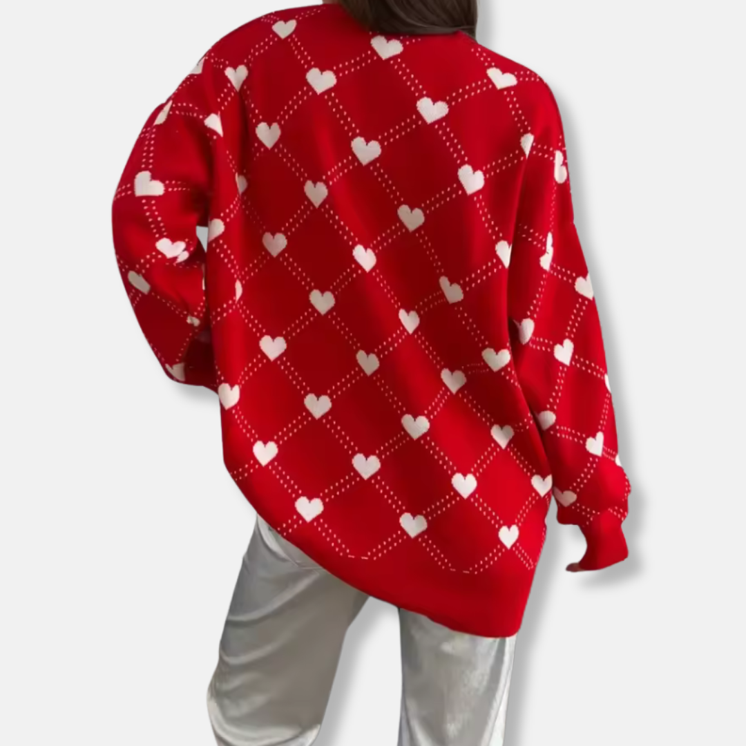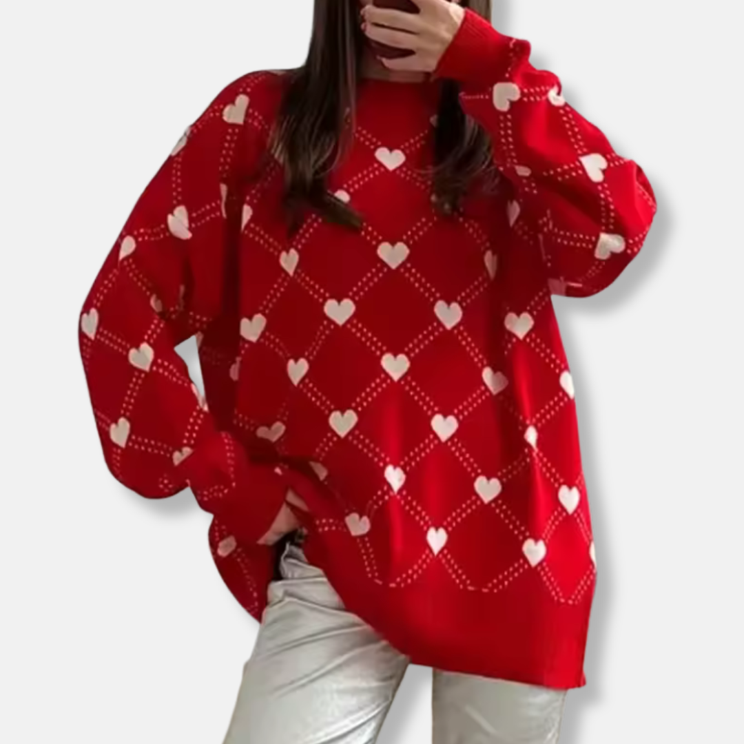 Women's Knitted Sweater – Loose Fit – Crew Neck – Heart Pattern – Ribbed Edges
