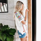 - Design: V-neck, floral print, short sleeve, relaxed fit