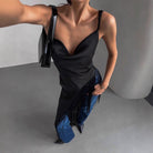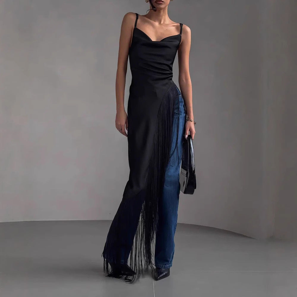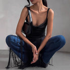 - Design: Slim fit, deep V-neck, sleeveless with thin straps, dramatic draped fringe at the side