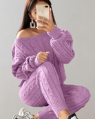 This knitted set, consisting of a sweater and matching pants, offers a comfortable and stylish appearance. The soft knit material provides warmth and a luxurious feel, while the sleek design offers both convenience and a fashionable look for everyday wear.