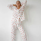 This women's pajama set with heart motifs features a playful design, perfect for a cozy and comfortable night's sleep. The set consists of a top and pants or shorts, with a cute heart pattern that offers a charming look.