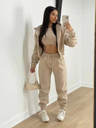 This stylish three-piece sweater set for women combines a modern design with practical versatility. The set consists of matching pieces that together create a harmonious and elegant look, but can also be worn separately for a varied style.