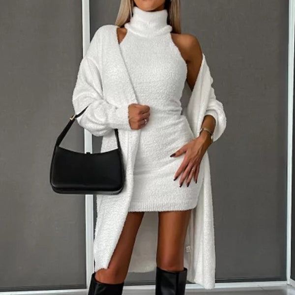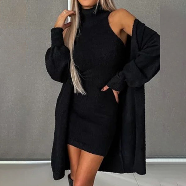An elegant and refined set consisting of a fashionable dress that is perfect for any occasion. This set offers a sleek, feminine look that exudes both comfort and style.