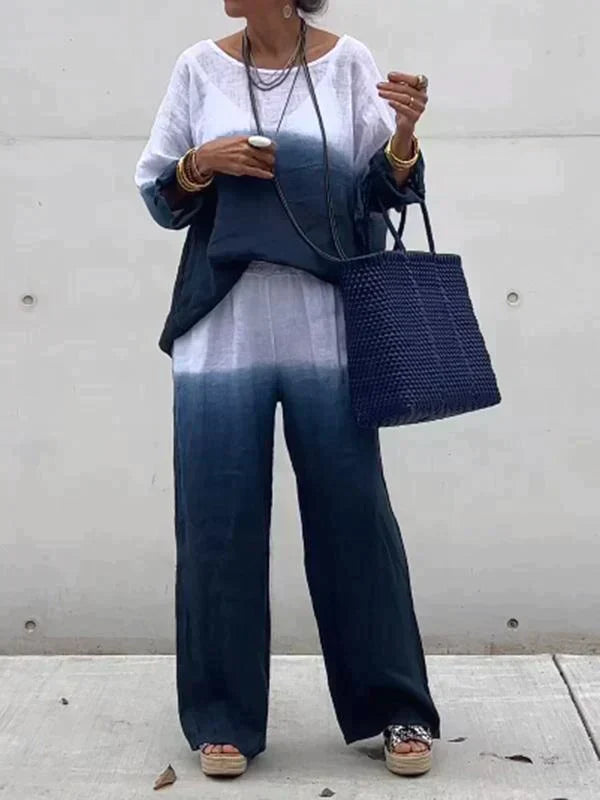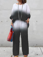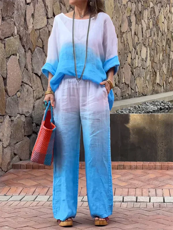 This two-piece gradient ensemble offers a modern and refined look. The design consists of a top and matching pants or skirt, with the subtle gradient providing a dynamic effect, perfect for both casual and semi-formal occasions.