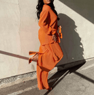This two-piece suit with loose, draped trousers offers a relaxed yet chic look, ideal for a casual outfit with a refined twist. The design combines the elegance of a blazer with the comfort of loose-fitting trousers, perfect for a modern, effortless style.